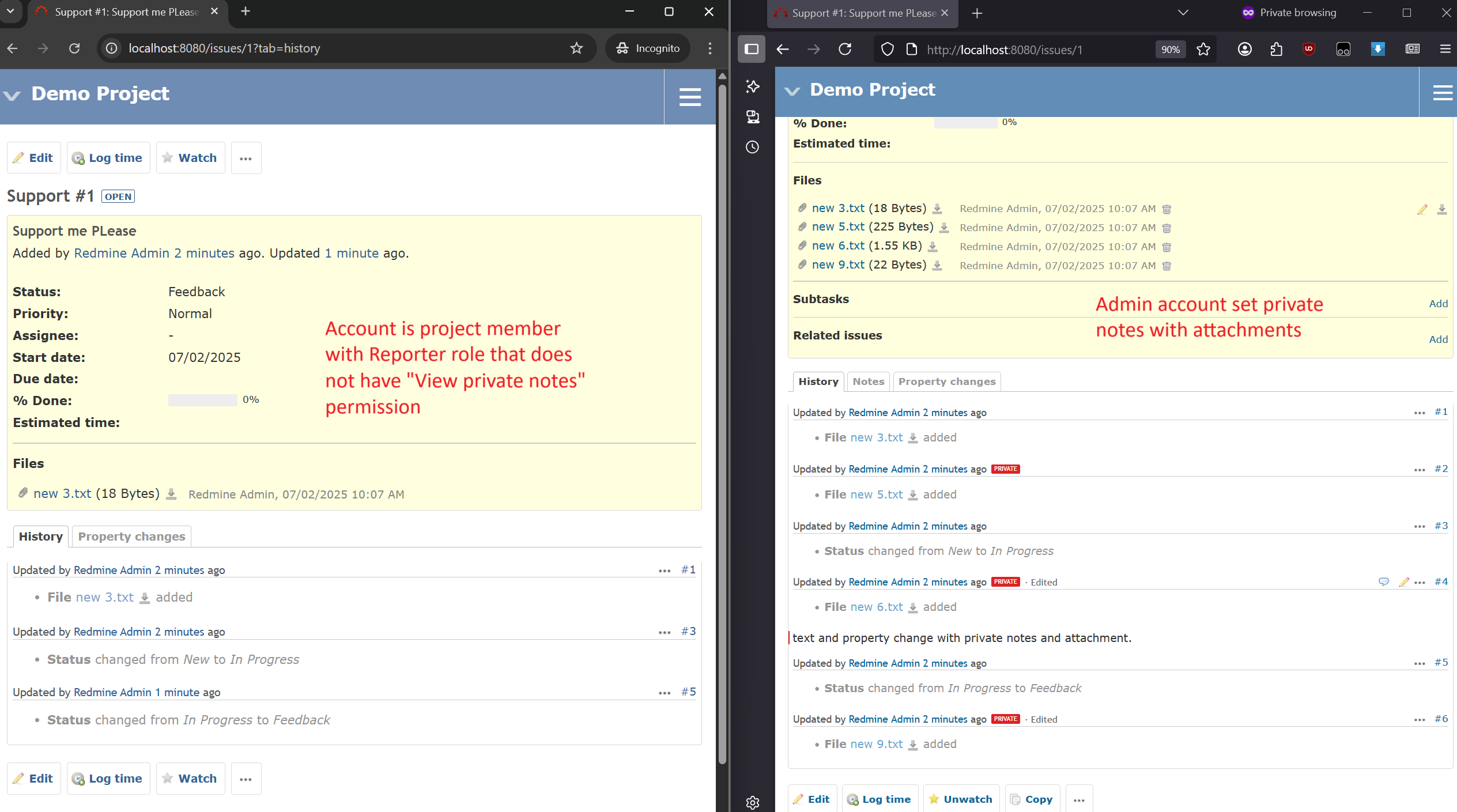 I see `split_private_notes` was designed to show property changes of an Issue and to hide text added as private. For example, if an Issue changes Status from New to In Progress, it can be reflected. My goal was to include attachments in that private_note journal detail. You can test with docker and load default Redmine configuration at Redmine Private Attachments · GitLab project.