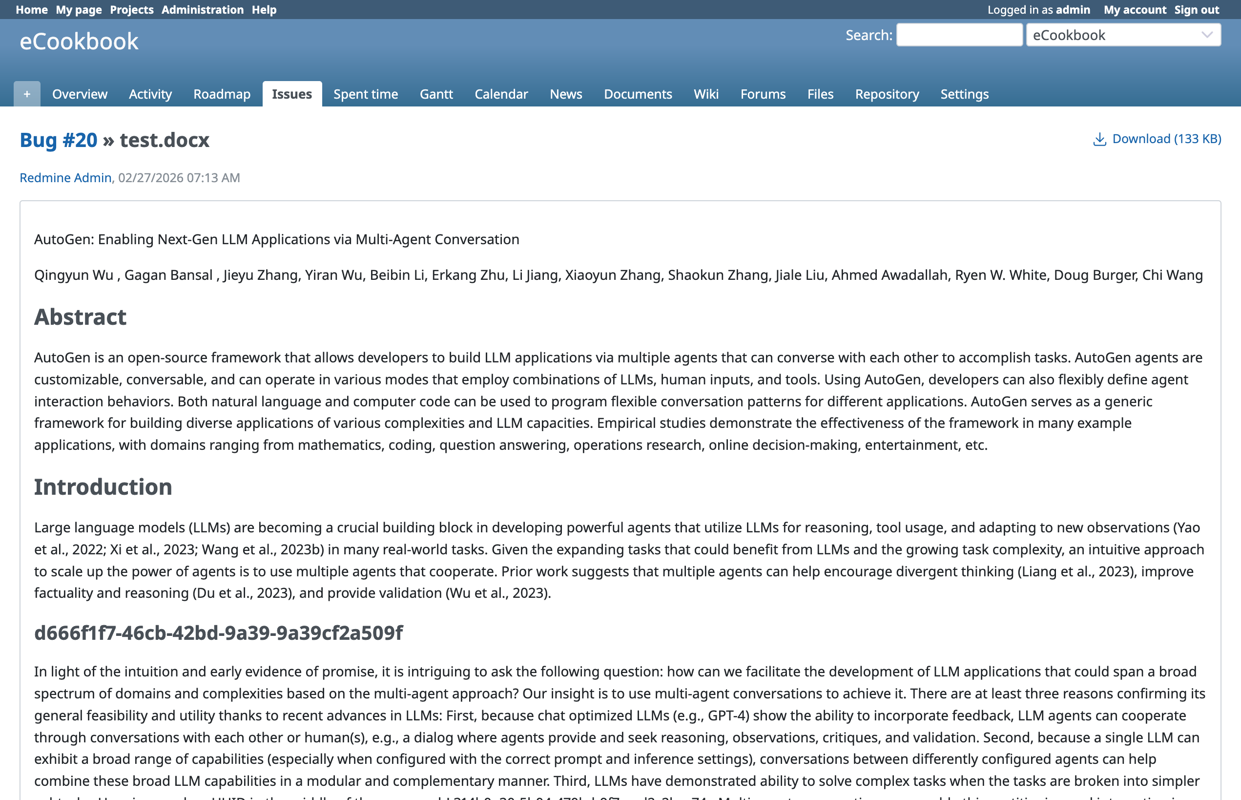 I wrote a patch to add a simple preview for Microsoft Office documents (such as Word, Excel, and PowerPoint) on AttachmentsController#show page. The patch uses Microsoft's MarkItDown command to convert supported Office files into Markdown and renders that Markdown in Redmine. Because the preview is generated from Markdown, original layout is not preserved and non-text contents will be lost, but it enables quick content inspection without downloading the file.