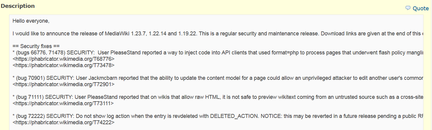 Hello everyone, I would like to announce the release of MediaWiki 1.23.7, 1.22.14 and 1.19.22. This is a regular security and maintenance release. Download links are given at the end of this email. == Security fixes == * (bugs 66776, 71478) SECURITY: User PleaseStand reported a way to inject code into API clients that used format=php to process pages that underwent flash policy mangling. This was fixed along with improving how the mangling was done for format=json, and allowing sites to disable the mangling using $wgMangleFlashPolicy. <https://phabricator.wikimedia.org/T68776> <https://phabricator.wikimedia.org/T73478> * (bug 70901) SECURITY: User Jackmcbarn reported that the ability to update the content model for a page could allow an unprivileged attacker to edit another user's common.js under certain circumstances. The user right "editcontentmodel" was added, and is needed to change a revision's content model. <https://phabricator.wikimedia.org/T72901> * (bug 71111) SECURITY: User PleaseStand reported that on wikis that allow raw HTML, it is not safe to preview wikitext coming from an untrusted source such as a cross-site request. Thus add an edit token to the form, and when raw HTML is allowed, ensure the token is provided before showing the preview. This check is not performed on wikis that both allow raw HTML and anonymous editing, since there are easier ways to exploit that scenario. <https://phabricator.wikimedia.org/T73111> * (bug 72222) SECURITY: Do not show log action when the entry is revdeleted with DELETED_ACTION. NOTICE: this may be reverted in a future release pending a public RFC about the desired functionality. This issue was reported by user Bawolff. <https://phabricator.wikimedia.org/T74222>