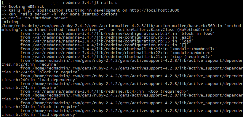 Also on another forum I was advised to check the reslut of "rails s" command from the Redmine root directory and occured another error: