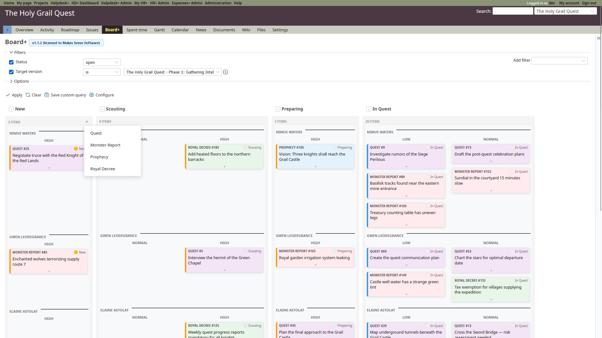 - Quick-create from any cell with context pre-filled. Right-click context menu for full Redmine actions without leaving the board.