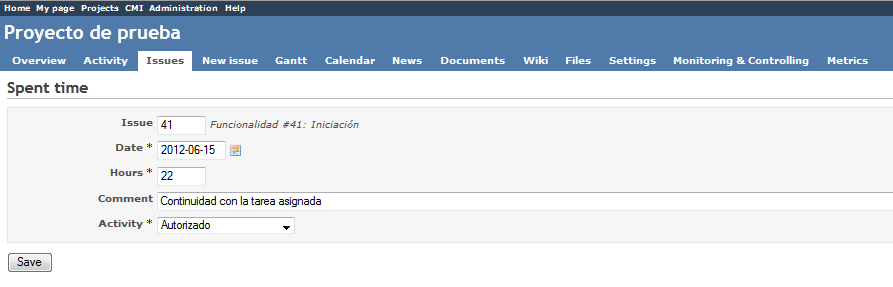 Parameters: {"project_id"=>"prueba1", "commit"=>"Save", "action"=>"create", "controller"=>"timelog", "time_entry"=>{"issue_id"=>"41", "comments"=>"Continuidad con la tarea asignada", "activity_id"=>"11", "hours"=>"22", "spent_on"=>"2012-06-15"}, "back_url"=>"http%3A%2F%2FXXX.XXX.XX.XXX%2Fprojects%2Fprueba1%2Fissues", "authenticity_token"=>"IXy8r0ylrZFcldCBoWkT5N+AIek5ssXLy7I="}