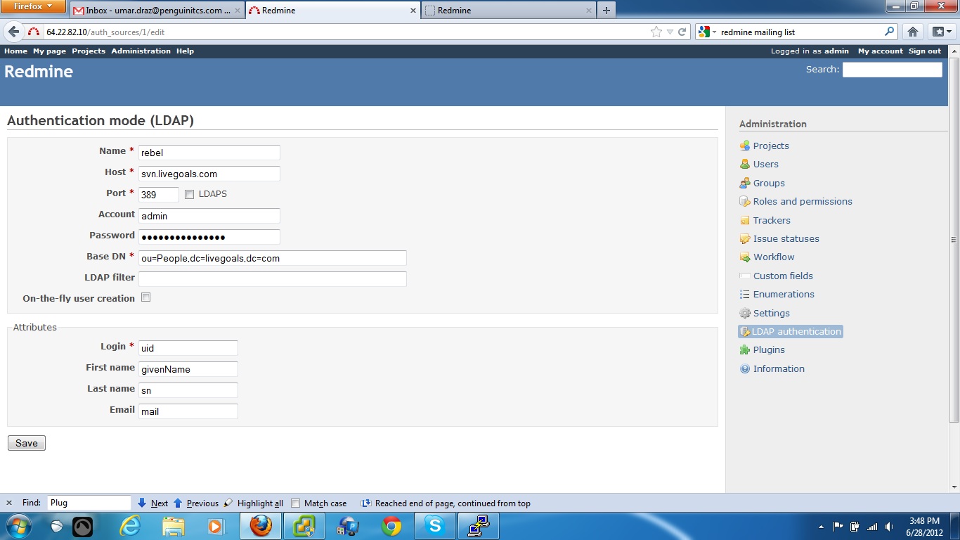 I am trying to configure authentication with LDAP, redmine connection with svn server creates successfully but still redmine not recognize ldap users. I have attached the images of my ldap authentication settings.