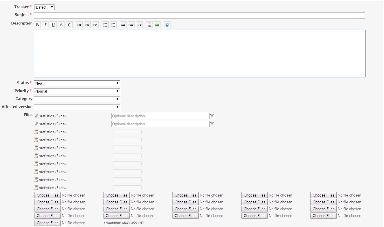 As a result, file attachment in Redmine tasks is "broken". When i try to attach a file, it loads up 2 copies of the file, also creating 8 empty fields and like 50 more "choose files" buttons.