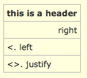 |_. this is a header| |>. right| |<. left| |<>. justify|rendered like this: