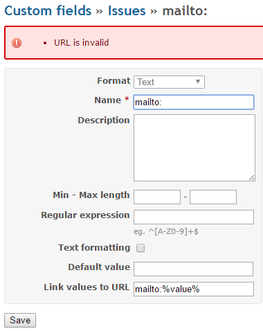 However, ruby URI.parse does not consider mailto: addresses invalid. The bug is that mailto:%value% is not in the form mailto:user@address.com (a valid email address). However, there is no other option to display clickable email addresses as a custom field. The validation here on the URL field should not apply, due to value being valid replacement syntax.