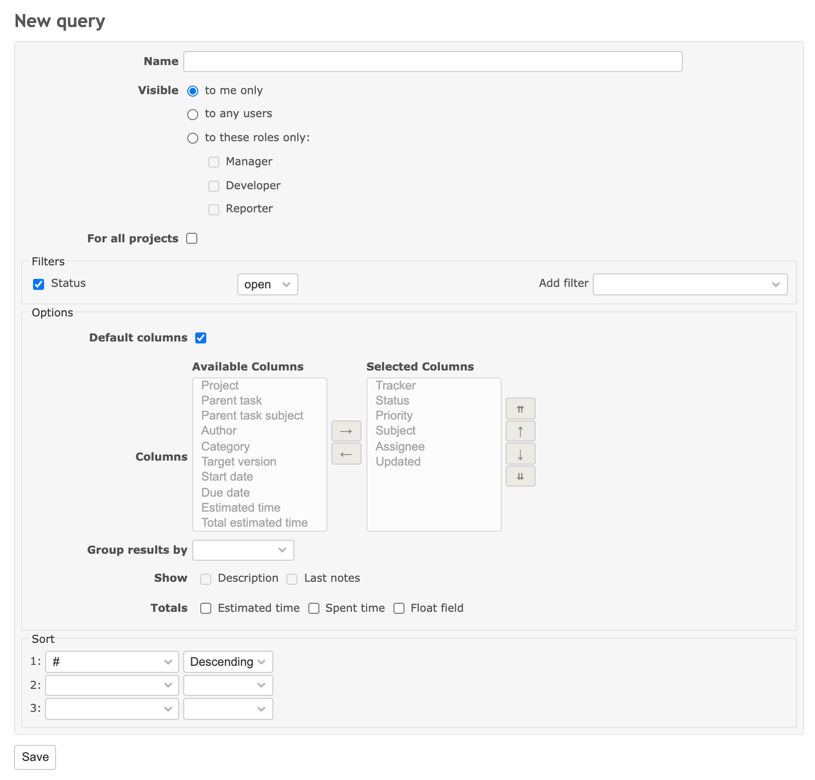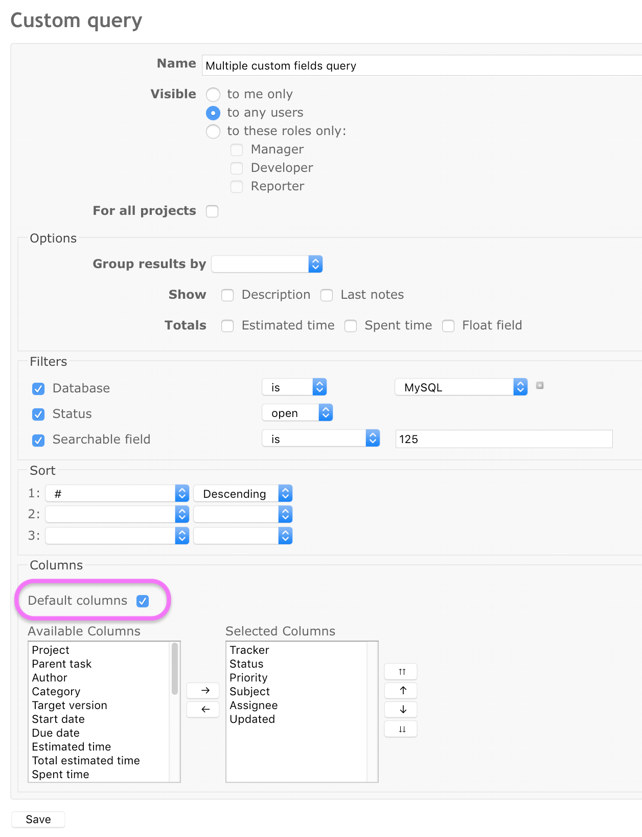 openMove "Default columns" checkbox on the query edit page from "Options" to "Columns" fieldset