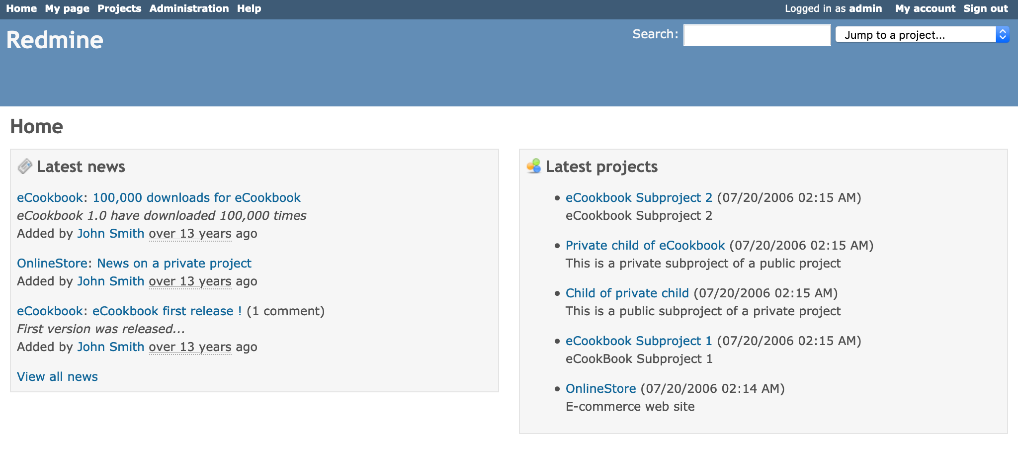 The following screenshot is the Home page of Redmine 3.1. The "Latest projects" box shows recently created projects.