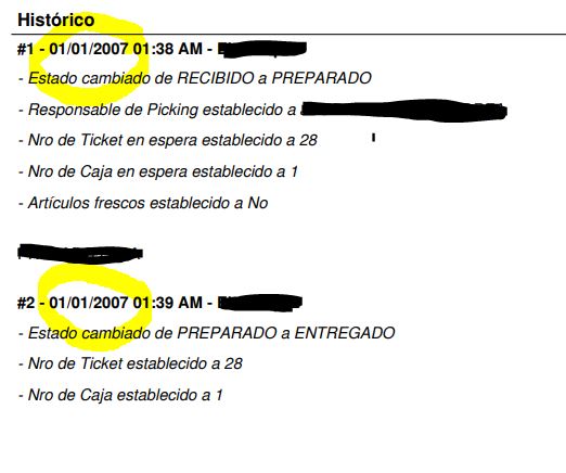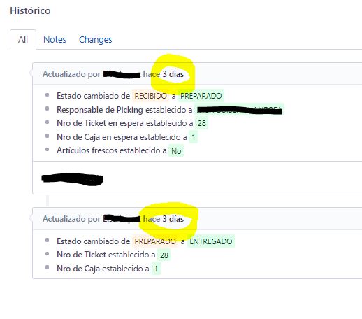 En las imágenes que adjunto se puede ver como las fechas que muestra la herramienta son diferentes dependiendo el caso. En el primero es la vista del Histórico, en el segundo caso es el historico pero luego de imprimir a .pdf la petición.