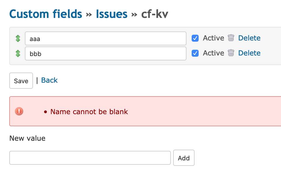 When editing the list of possible values for a key/value custom field type, clicking "Add" with the field empty will lead to a HTTP 500 error from Redmine. An example stack trace is attached. The error is confirmed on current master.