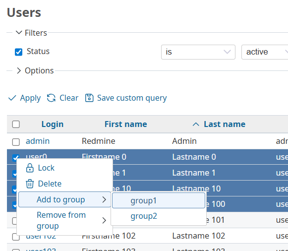 confirm: l(:text_are_you_sure)Alert is rather pointless. Yes, there are a few instances of these in Redmine, but we should not add more. Better add a real confirmation which specifically confirms the action taken, including a full list of users being added / deleted. - The context menu option to delete users from a group should filter the groups the selected users are actually in instead of offering all groups. And maybe even disable the option unless there are any groups which each include all of the selected users.