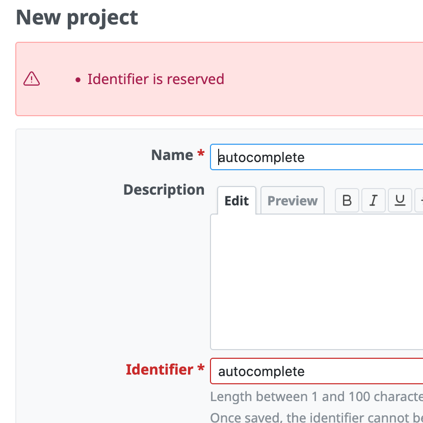 Currently, accessing /projects/autocomplete results in an error because it matches the existing projects#autocomplete route instead of the normal projects#show route. Because this identifier conflicts with an existing action, autocomplete cannot be used as a project identifier and therefore must be reserved.
