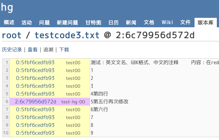 Line 1 is "测试:英文文名、GBK格式、中文的注释 内容:在redmine中显示以及changset文件是否是乱码".