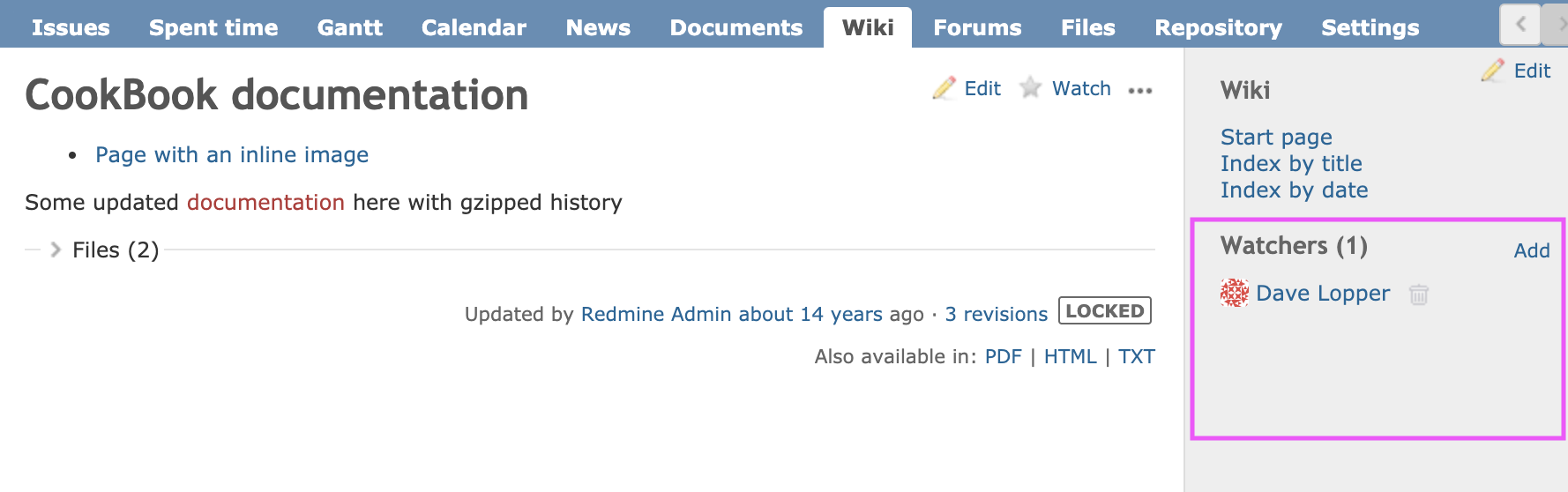 - Subject changed from Ability of assign watchers to Wiki pages to Ability to add watchers to Wiki pages