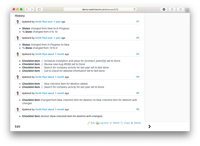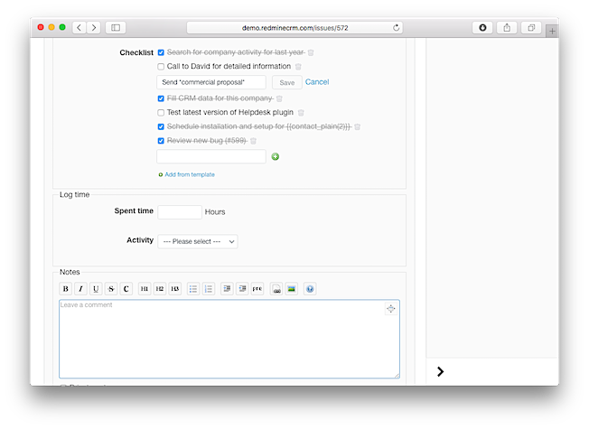 - Use Redmine textile formatting and CRM plugin macros for checklists