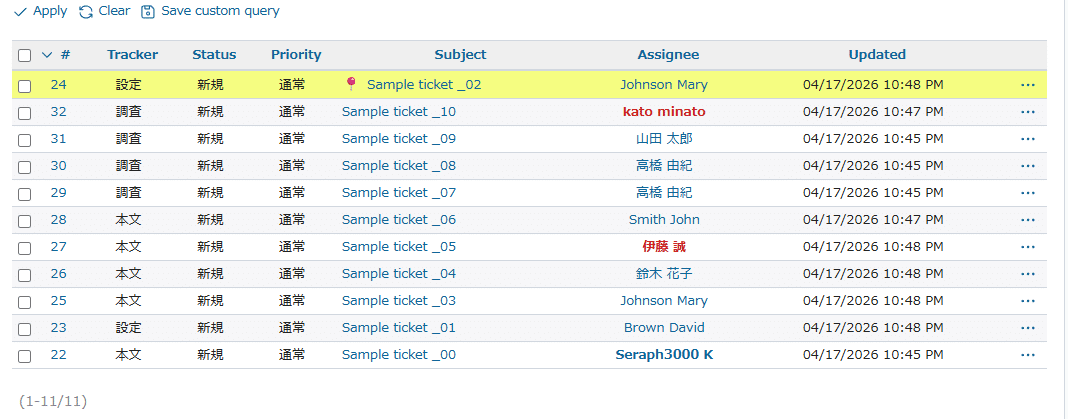 - (Optional) Administration > Plugins > Redmine Pinned Issues plugin > Configure: adjust the pinned-row background colors (odd / even).