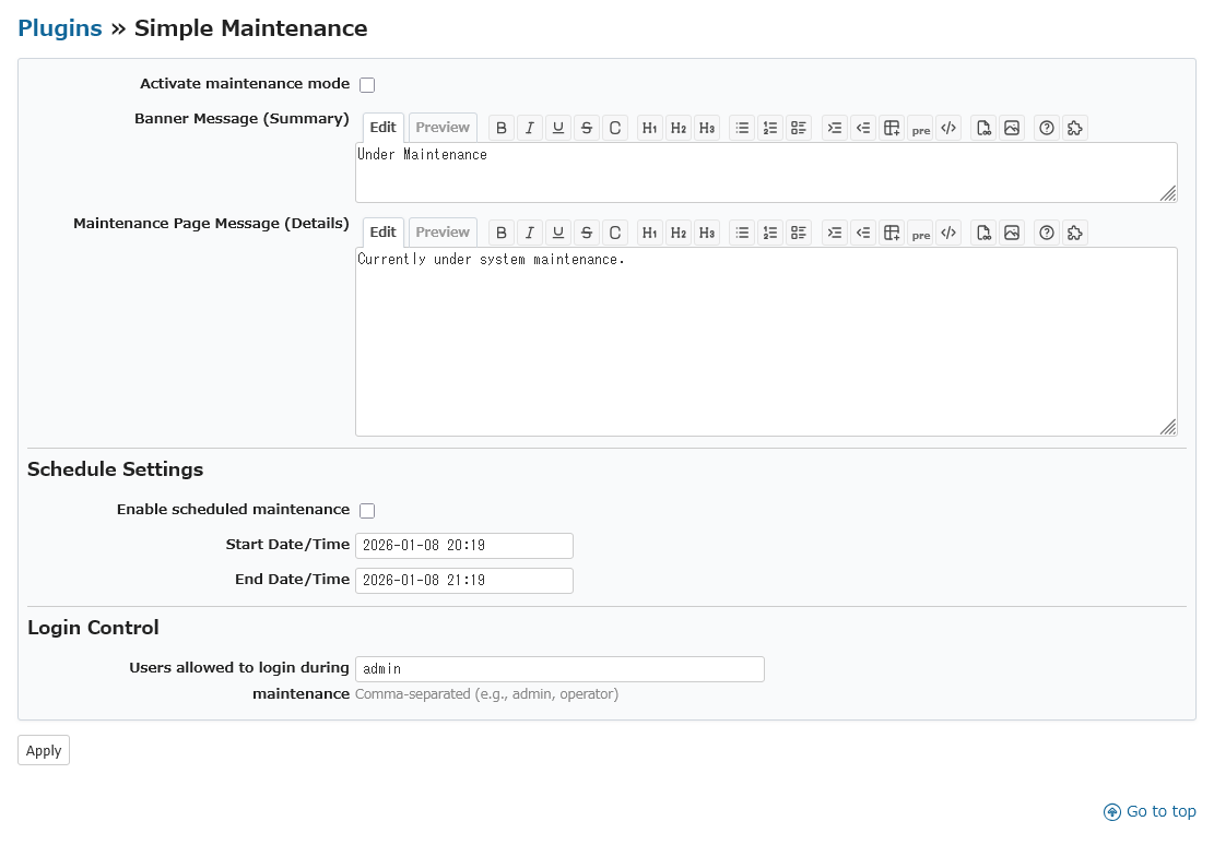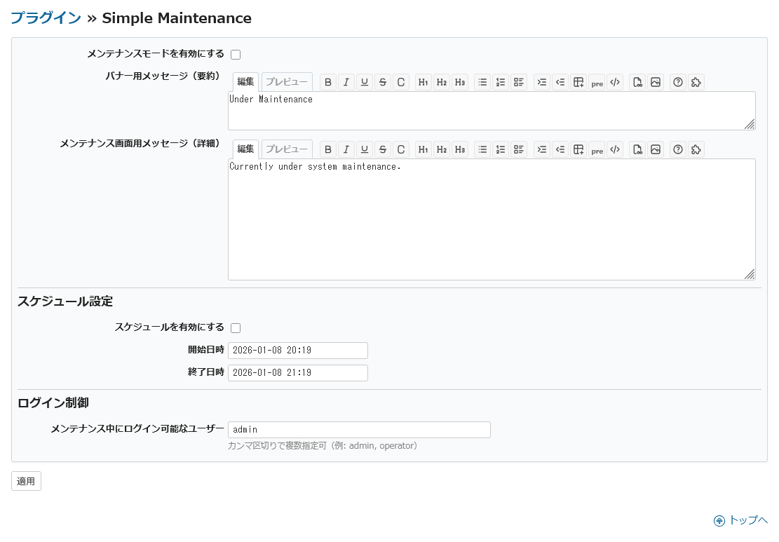 4. Configure at Administration > Plugins > Simple Maintenance