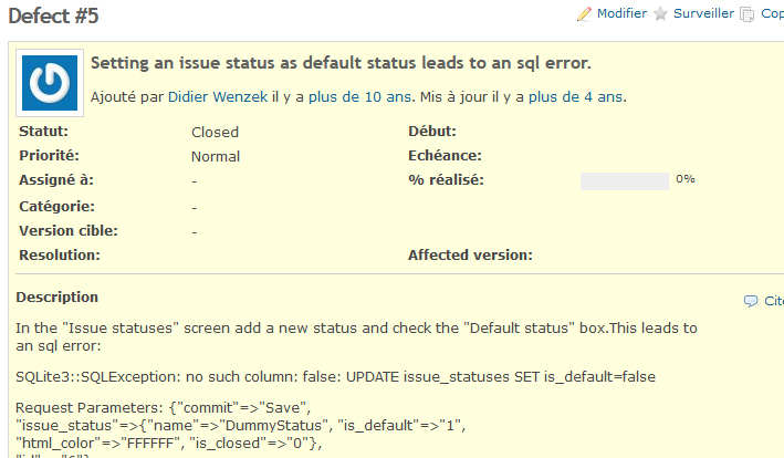| {{issue_fields(5,subject)}} | Setting an issue status as default status leads to an sql error. |