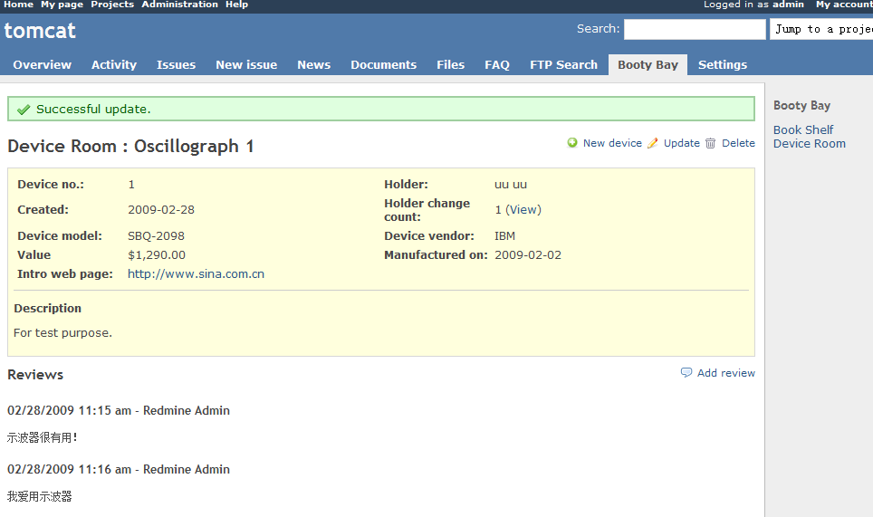 It's a book shelf and device room management plugin for redmine. It's designed for a internal use.